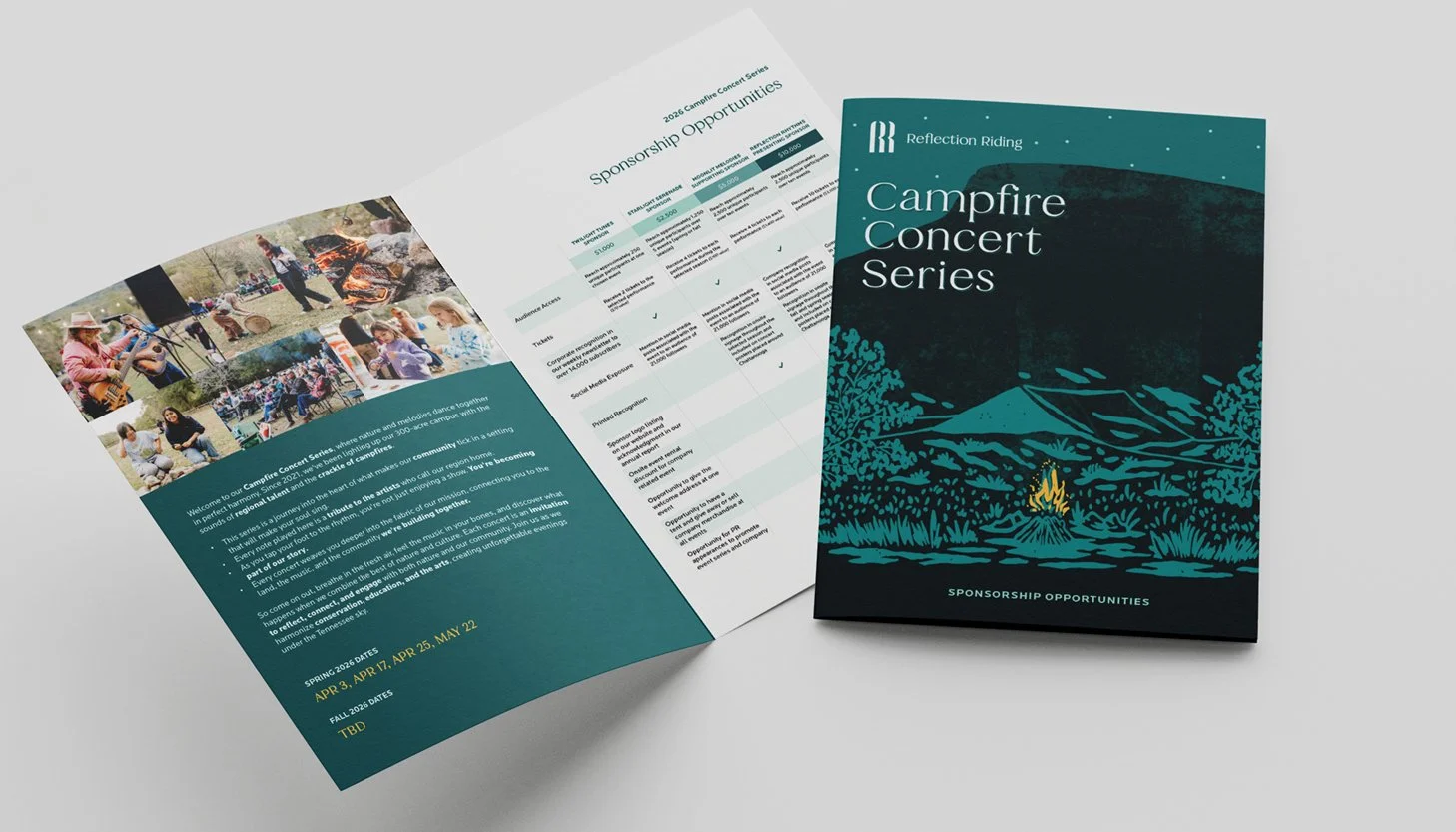 Several years ago, we created the brand identity for Reflection Riding, establishing a visual foundation rooted in their mission of reconnecting people with nature. Building distinct visual identities for their signature events has provided an opportunity to enrich and expand upon this core identity, all united by hand-drawn natural elements. Check out Brunch and Blooms, Campfire Concert Series, and Notes in Nature (coming soon). How fun to get out of the mac sometimes!